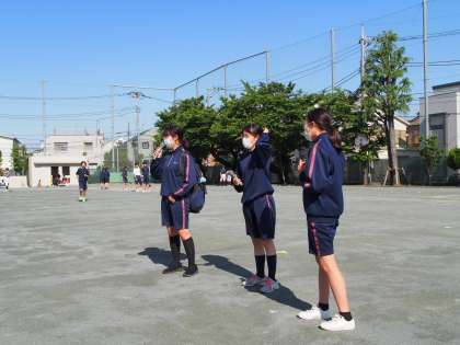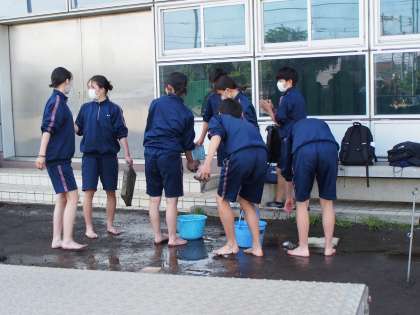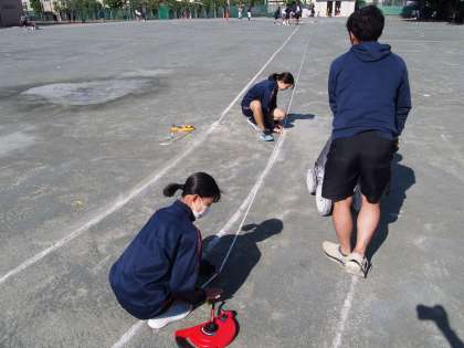 校庭では火曜日の準備を各委員会生徒がしてくれています。ライン引き、マイクテスト、水たまり除去などなど。午後の校庭は、晴れ間が出ていたせいか「いまなら運動ができる」というほど、最高のコンディションでした。【菅野】