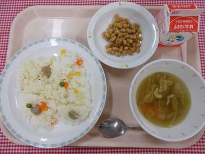 三色ピラフの三色は、にんじん・コーン・グリンピースでカラフルに仕上げました。