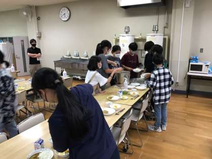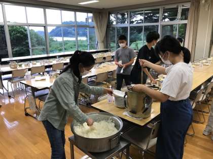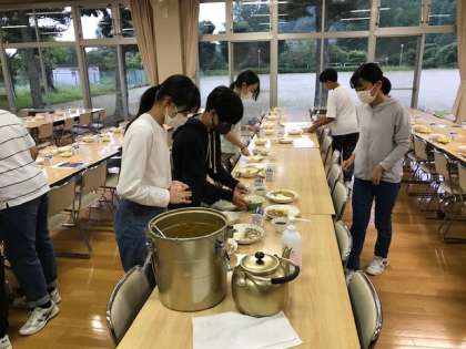 ?食事係が夕食の準備をしています。今日はカレーライス。昼なほうとうをたくさん食べた後でも、おかわり続出の予感がします。
