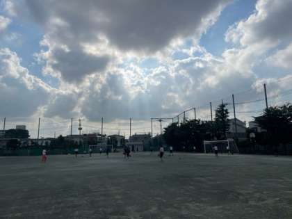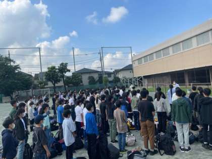 校庭で開校式をしてスタートしました。隣では野球部が朝練中です。