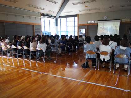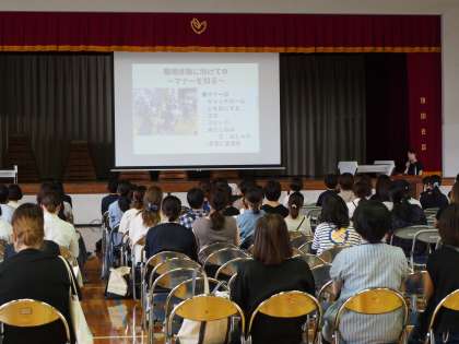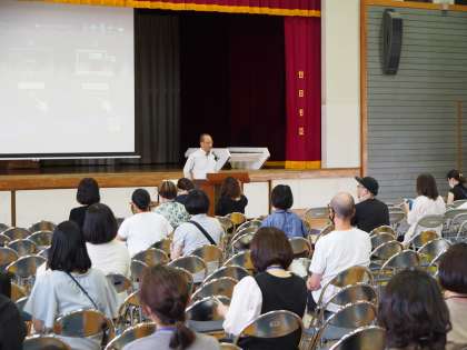 本日午後、1学期末の保護者会が行われました。全体会のあと、各学年に分かれ、1学期の様子を話し、また画像で生徒の様子を紹介していました。
