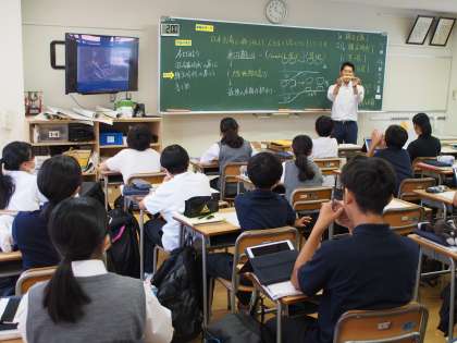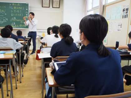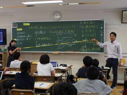 14期生の歴史授業では、旧石器時代〜縄文時代までの長さと、弥生時代から現代までの長さを黄色のテ−プで比べています。確かに分かりやすい!フナキボ社会科の授業は公開授業の時の感想でも「とても分かりやすい」と評判です。生徒も思わず釘付けです。【菅野】