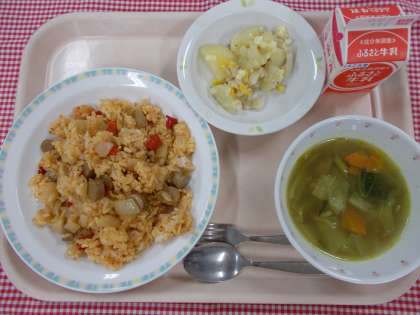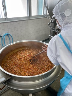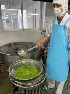 ピーマンは茹でたり湯かけをすることで苦みを減らすことができます。今日はジャンバラヤの具に入れる前に湯かけをしています。具はケチャップやホールトマトが入るので、グツグツ煮込むことでまろやかで美味しくなります。