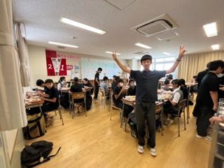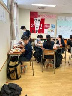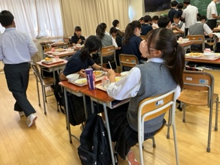 久しぶりに給食が楽しいーと、生徒も喜んでいるようです。班は崩さないのが原則で、2人だったり、男女別だったりする班もありますが、ちょっとずつ慣れてクロスを敷いて食べる日が来ますように!一年生は、来週から班にしてクロスを敷いて通常の給食にする予定です。(大橋)
