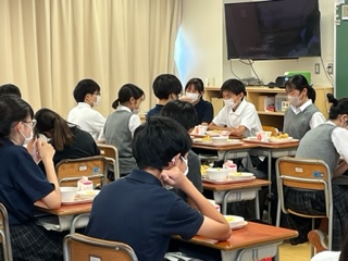 2年生は、?3年ぶりに給食を班にしてみました。学級委員が考えて、嫌な人には強制せず、班にしたり、前を向いたりして食べることにしました。クラスによっては、全員前を向いているところもあります。(大橋)