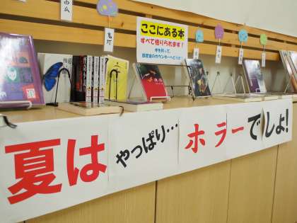 今日も朝から猛暑の予感がするフナキボの朝です。図書室前も盛夏の仕様に衣替えしました。