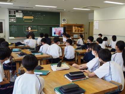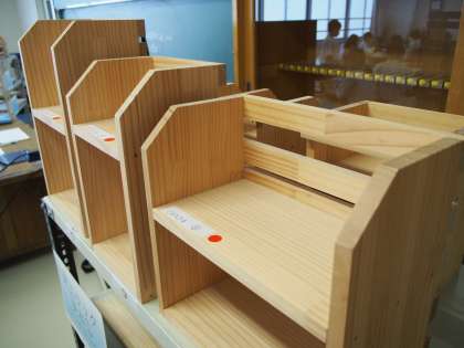 1年生の技術は木工のけがきをやっています。先生が順序だてて丁寧に説明してくれていますが、それでも不安な生徒のために、けがき完成品やラックの見本が用意されていました。【菅野】
