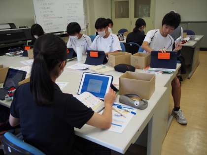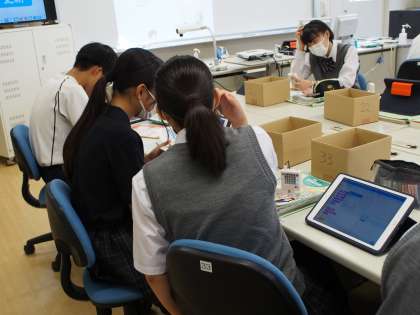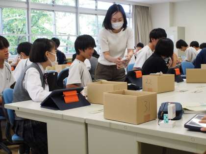 12期生の技術はプログラミングの授業です。タブレットとキットを使って挑戦しています。タブレットを自由自在に使いこなす3年生ですが、さすがにプログラミングキットとの併用はちょっとハードルが高いらしく、質問の手か次々に上がり、先生は大忙しでした。【菅野】