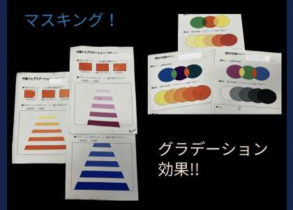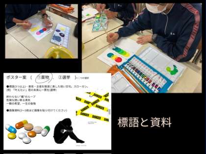 ?マスキングテープとグラデーションによる効果を体験。→ ポスターの要素を学び、タブレットでアイデアを深めながら各自テーマに沿ったイメージをプリントにまとめました。