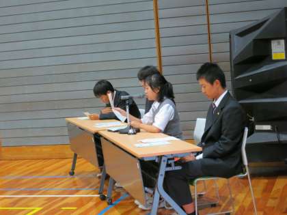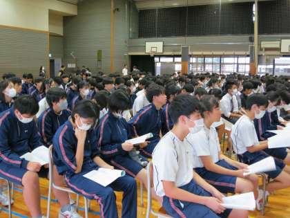 もちろん選挙管理委員の進行がなければ立合演説会も選挙もできません。堂々とした司会進行に感心させられます。そして、聞く態度が立派なのは、最前列だけではないことも証明しようと画像を載せました!今日は700人近くが入りましたが、換気をしっかり行ったこともあり、生徒の座席したに置いた二酸化炭素濃度計の数値は最後まで緑色の中に入っていました。【菅野】