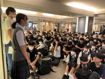 出発式です。同行者紹介、実行委員長挨拶と続いていますが、皆静かに聞いています。さすがフナキボ!