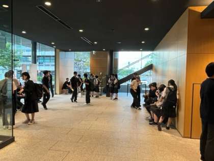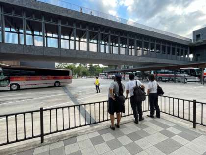 バスターミナルでバスを待つ添乗員さんです。他校のバスが渋滞してなかなか現れません。