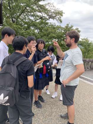 外国人観光客に班でインタビューしています 緊張するー!といいながらも、勇気を出して話しかけていました 水巻