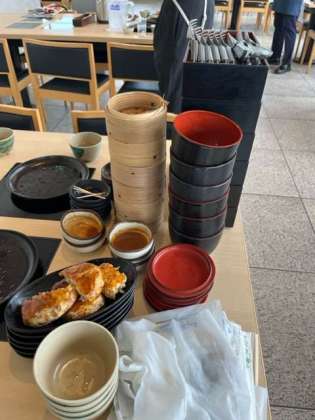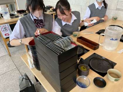 今日の昼食場所での出来事です。食べ終わった器を重ねている班がありました。「えらいねー」と声をかけると「いえ、隣の班がやっていたので」と返事が返ってきました。良いことは見習う精神が良いですね。あれっ、もしかして残したおかずも美しく並べた?と、