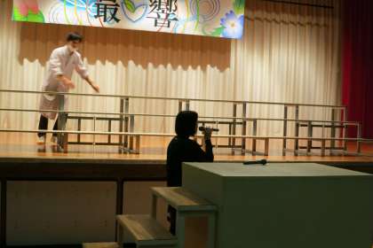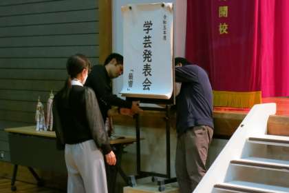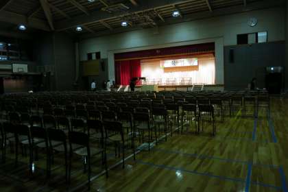 生徒が下校したあとの体育館では,明日に備え最後の確認と準備作業を行っています。表示,マイク,音響その他やることはたくさんありますが,先生たちも疲れているはずなのになぜか生き生きしている様子にみえる。そう,気持ちは生徒と同じなのです【菅野】