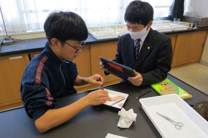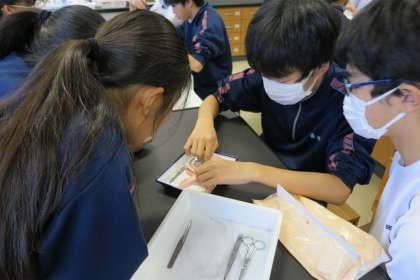 理科の実験では鶏の手羽を解剖して筋肉や筋のつき方を観察していました。普段食べる部位ですが、生のままだとこんなに違うのか、と興味津々の様子。【菅野】