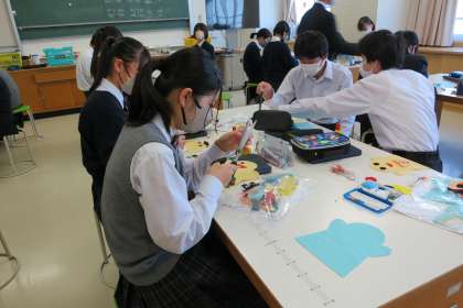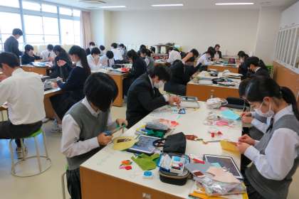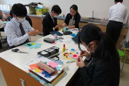 園児向けの布のおもちゃを作っています。みんなの顔が真剣です。【菅野】