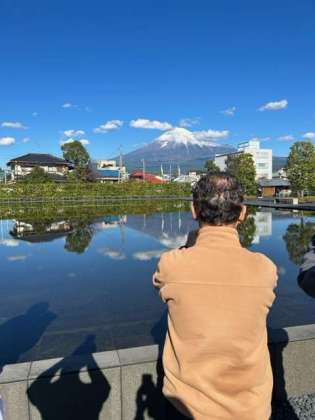 静岡県の富士山世界遺産センターに来ました。逆さ富士を撮影する菅野学校長です。