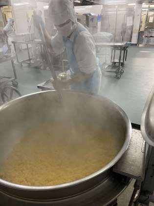 あんかけチャーハンは、味付けしたごはんに炒り卵を混ぜ、チャーハンにしています。炒り卵は、大量だときれいに細かく作るのが大変です。大きいホイッパーでひたすらかき混ぜ続けます。今日も頑張って作ってくださいました。