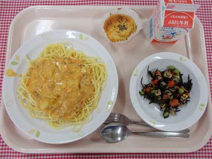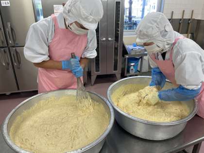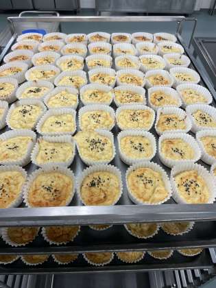 お豆のケーキには、白いんげん豆のペーストを使っています。豆のかたまりがないようによ〜〜〜くつぶしながら他の材料と混ぜ、カップに入れて、ごまをのせて焼いています。焼いた後は豆の味はほとんど分からないくらいで、苦手な人にも食べやすい仕上がりでした。