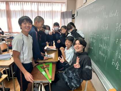 1-4の数学前の休み時間には先生の周りにたくさんの生徒たちがいました。楽しそうです!