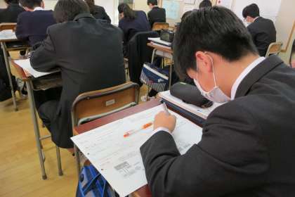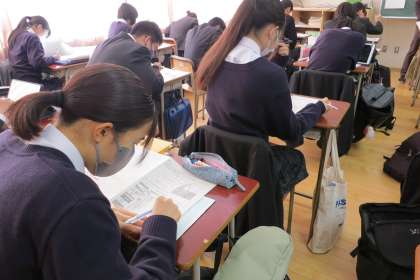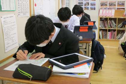 今日のまとめを自分の言葉でまとめています。先生から「書き始めるまでの時間が、三年の最初よりすごく早くなりましたね」とおほめの言葉が。こんなところも12期生は成長しています。【菅野】