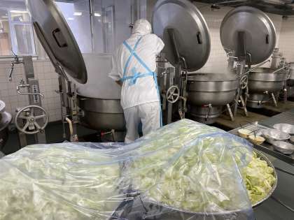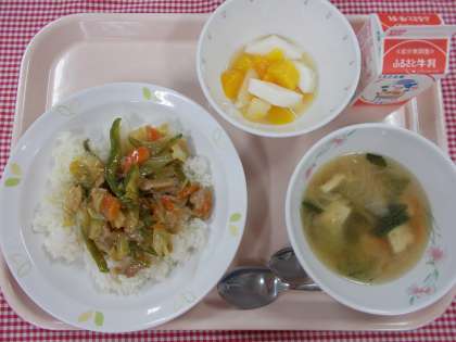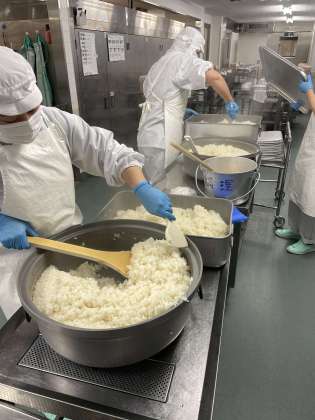ごはんは、丼の時はいつもより量を増やしていますが、とてもきれいによく食べてくれています。ホイコーローは、キャベツを66キロ使用するので、大きなザルに4つ分になりました。かさがとてもあるので、2釜に分けて炒めています。強火でさっと炒めているので、シャキシャキの歯ごたえが楽しめました。(火はしっかり通っています)
