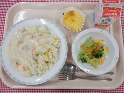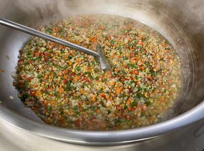ピラフには、赤と緑のピーマンを入れ、カラフルに仕上げました。
