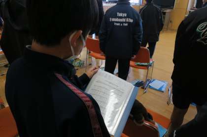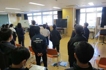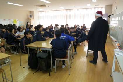 今日で2学期は最後の授業となります。英語の授業ではALTの先生が豪華衣装で授業中。そして音楽では久しぶりに終業式で歌う校歌を特訓中。まず歌詞をしっかり覚えることか大切です【菅野】