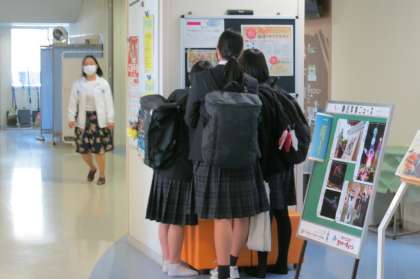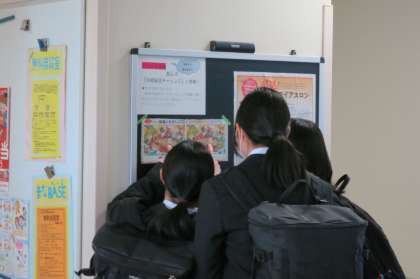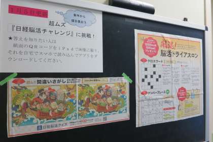 NIEコーナーの一角に小さな掲示板があります。そこには日経新聞の「まちがい探し」が貼ってあり、生徒が一生懸命取り組んでいる姿をよく見かけます。今日も帰り際早速3人組が挑戦していました。そうなんです、ここに来る生徒はなぜか3人組が多いのです【菅野】