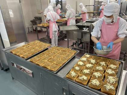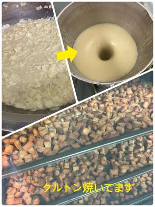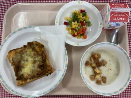 ポタージュは、たまねぎやジャガイモを柔らかくなるまで煮て、ミキサーにかけ、さらに濾してから、牛乳や生クリームを加えて仕上げました。サラサラとした口当たりで、大好評でした。