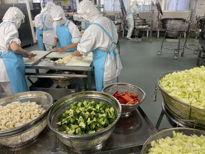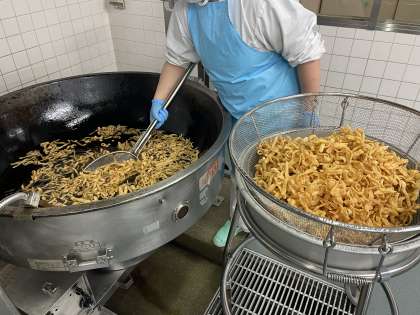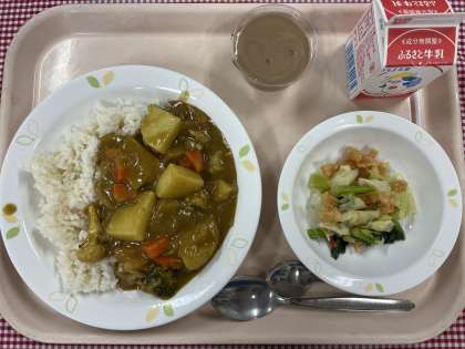 冬野菜のカレーライスには、冬が旬の野菜がたくさん入っていました。今日は、せたがやそだち野菜も使用しました。品目は「ブロッコリー」「カリフラワー」です。予定では、「にんじん」も使用する予定でしたが、気候が例年より温かく、成長が早かったため、入荷することができませんでした。せたがやそだち野菜を使用することで、地産地消となり、輸送エネルギーを節約できるため、地球にやさしいです。また、安心・安全な野菜です。これからも活用していきたいと思います。