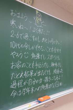 昨日からの雪に覆われたふなきぼの朝です。校庭も雪。でも担任からのあたたかなメッセージが、登校した生徒の心を温かくしてくれます。