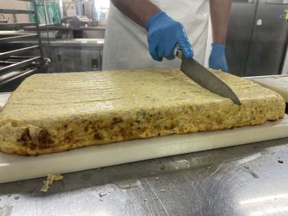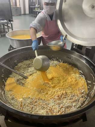 オムレツは鉄板に流して焼き、カットして配缶しています。