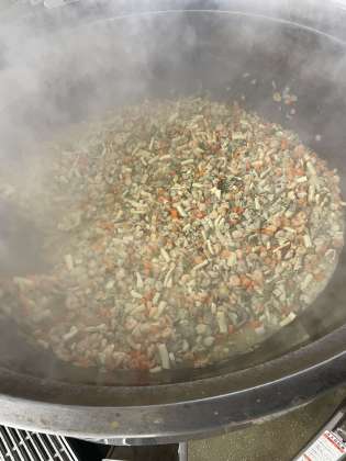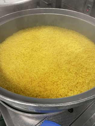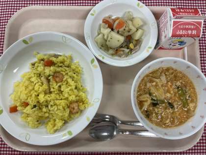 スぺインの料理でした。パエリアは、ターメリックで鮮やかな黄色に炊けました。具は別で作り、混ぜ合わせて作っています。ソパ・デ・アホの「アホ」はにんにくのことで、にんにくのスープのことです。