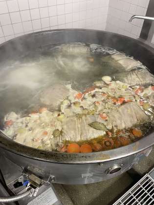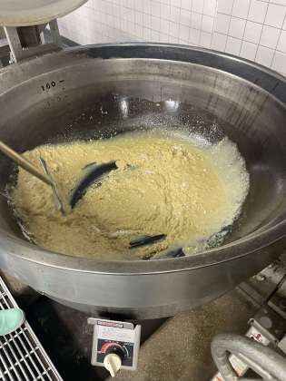 ポークシチューは、スープを鶏ガラや野菜の切れ端から取り、ルゥは小麦粉をバターで炒めて作っています。写真は小麦粉を入れたところで、ブラウンルゥの色になるまでじっくり炒めています。