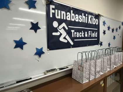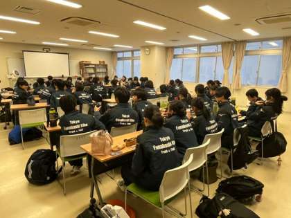 会議室で陸上部の送別会が始まる前にみんなでお弁当を食べています。この後ろ姿もフナキボ生そのものです【菅野】
