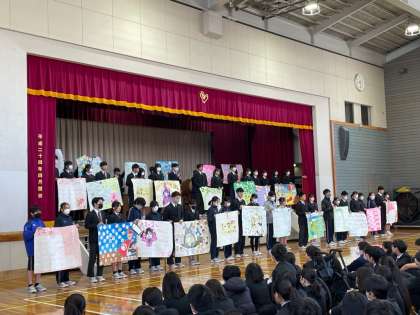 朝礼で1.2年生から3年生へ、クラスレターの贈呈式を行いました。