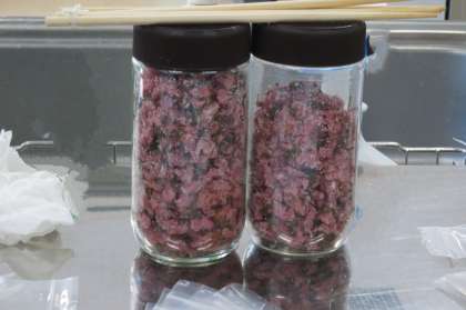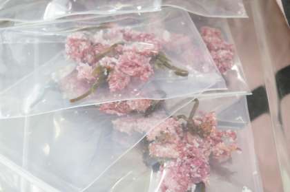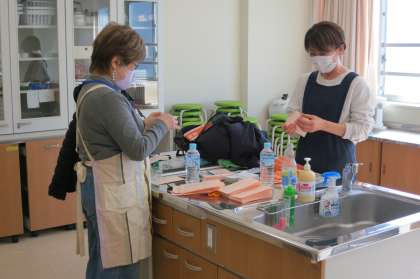 学校支援地域本部、いわゆる「ふなきぼサポートクラブ」による桜漬け。昨年に学校で採れた桜の花びらを約1年間校長室の冷蔵庫に塩漬けしたものを卒業生に渡すための小分け作業です。ちょうど体育館で12期生が式練習をしている時間に行われていました。【菅野】