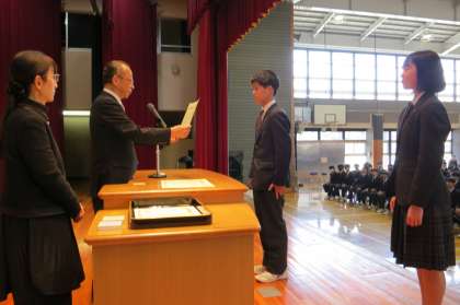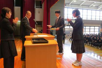 最後に予行の時の恒例となっている、産業教育奨励賞と体育優良生徒の発表、表彰がありました。対象の生徒の名前が発表されると、大きな歓声がわきあがり続いて拍手が起こりました【菅野】