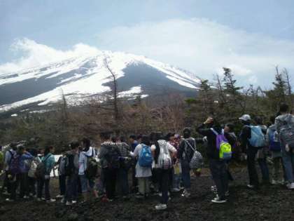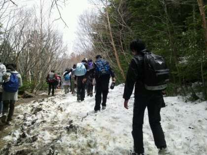 富士山五合目からは雪のため、御庭側から御中道へ雪の残る遊歩道を散策をしました。奥庭荘で昼食をとり、12 時40 分にフィールドセンターに向かい出発しました。