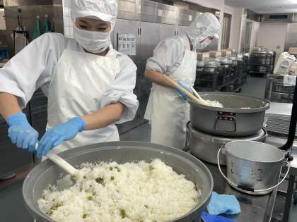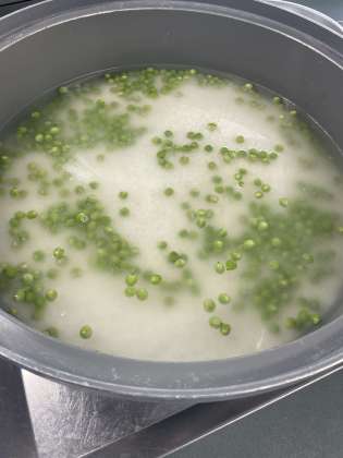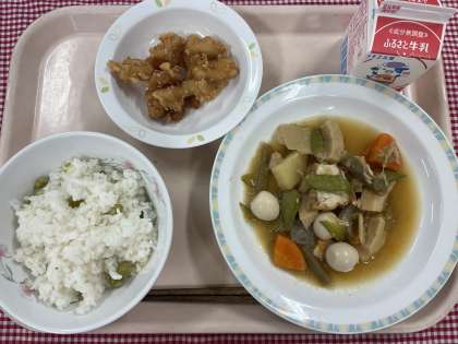 今が旬の生のグリンピースを、ご飯と一緒に炊き上げています。煮物にも、旬の食材をたっぷり使って味わいました。いかのかりんと揚げが特に人気で、たくさんの子がおかわりしてくれました!!