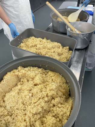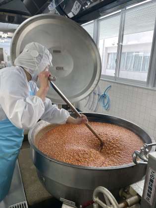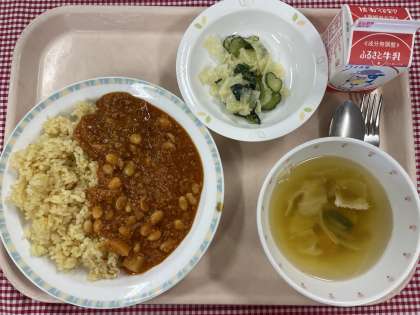チリビーンズライスは、ごはんにカレー粉やトマトピューレを炊き込んで、仕上げにバターを加えています。ソースには、チリパウダーやタバスコを含め17種類もの材料が入っています。辛さは控えめで、1年生も辛すぎずに食べられていました。