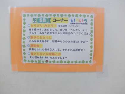 さて、今回は再び掲示物です。月ごとに変わる給食コーナーや図書室のお知らせ、毎日日直が選ぶ新聞記事を掲示するNIEコーナーなど、しっかり読んでもらいたい掲示がたくさんあります。ぜひ、足を止めて読んでほしいと思います。