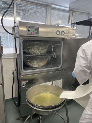魚のチーズ包み揚げは、さばをチーズと一緒に春巻きの皮で包んで揚げています。魚が苦手な人も食べやすく、人気でした。和風サラダなどの和え物は、野菜をボイルした後に真空冷却器で急速に冷やしています。8度まで冷やしてからドレッシングで和えているので、シャキシャキで美味しく食べられます。