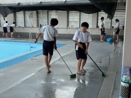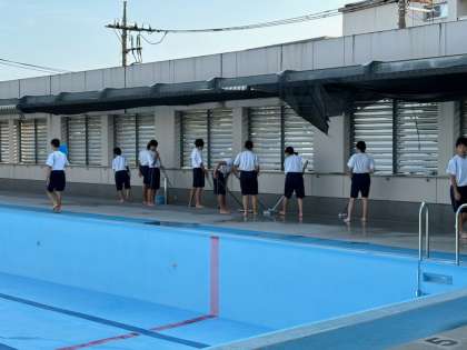 プールのお水を抜き、きれいになりました。プールサイドの掃除もバッチリ!期末考査後から泳ぎ始めます。(片山)