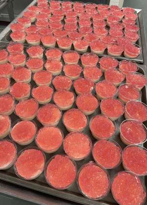 あじさいゼリーは、牛乳寒天の上にクラッシュしたクランベリーゼリーをのせています。色が鮮やかできれいでした。