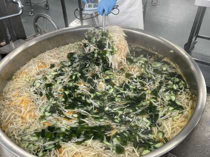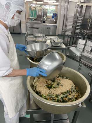 わかめサラダなどのサラダは、基本的に野菜はボイルして、基準の温度を超えてから上げ、急速冷却しています。混ぜるごま類も、乾煎りして温度を上げてから、冷却しています。給食では、温度管理がとても大切です。