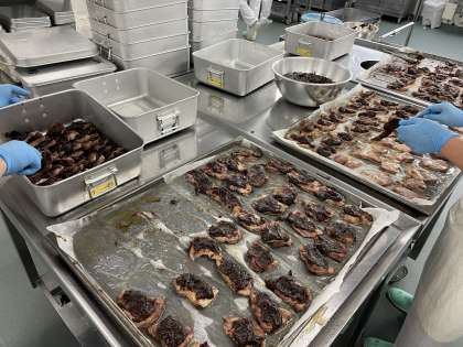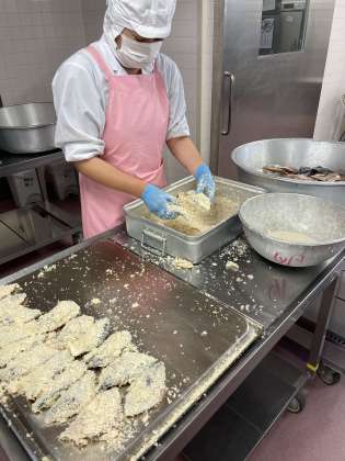 トンテキ丼は焼いてソースを塗り、ブリカツ丼は衣をつけて揚げています。給食室では朝から気合いが十分でした!!