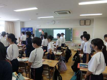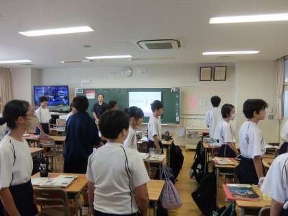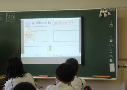 授業の初めに体を使って「Turn right」などの表現を確認して授業に入り、最後は命令形のまとめをして終わりました。授業は楽しく、あっという間に終わりました。